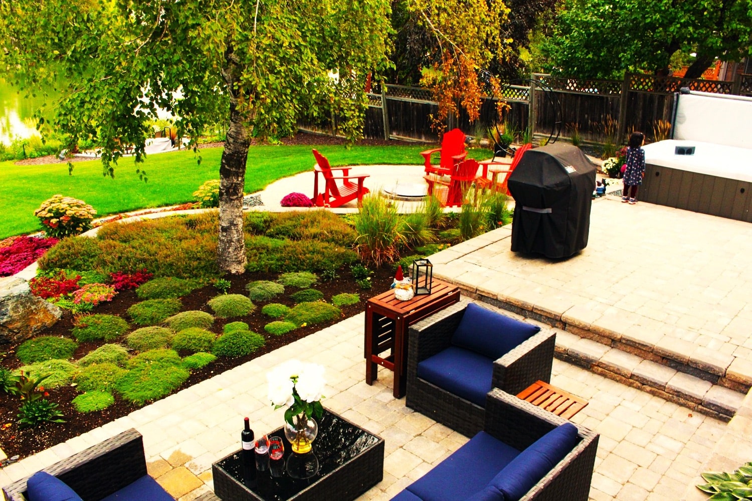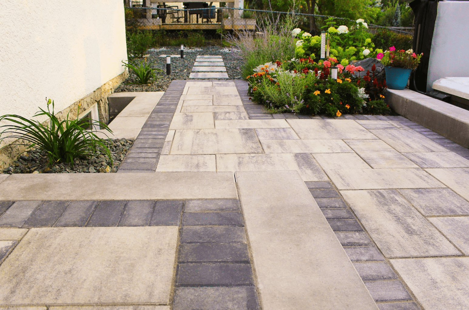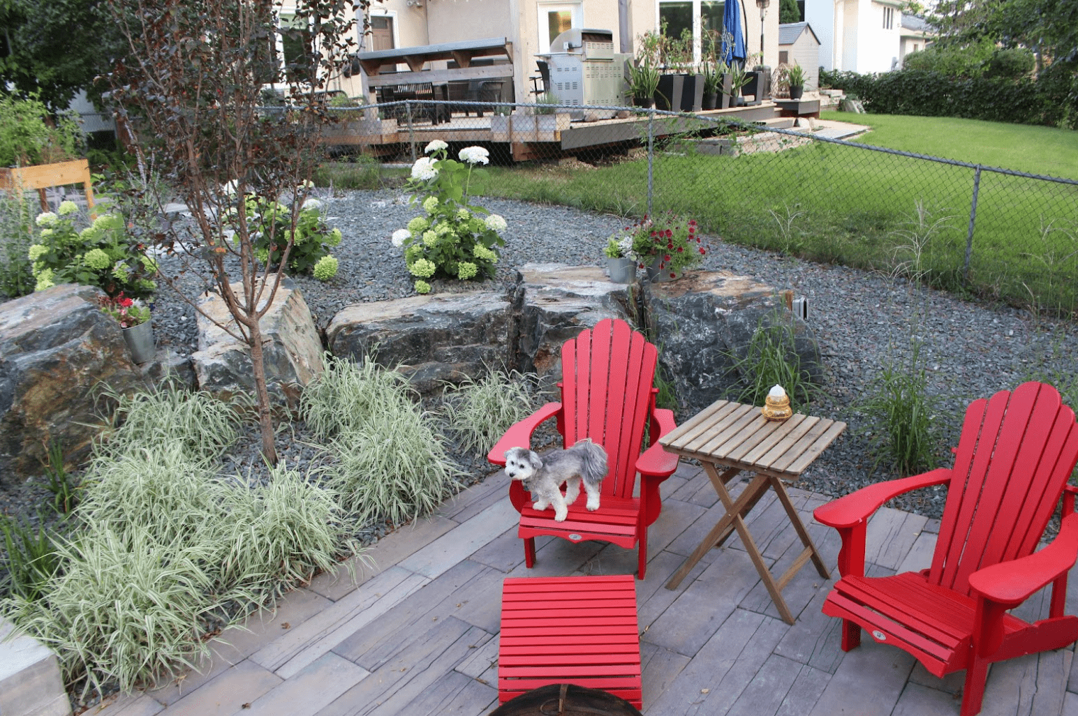 We used 3D rendering software to allow our clients to immerse themselves in their project and ensure that they were going to love the results before we even broke ground. The patio and path are Barkman Broadway pavers with a Holland soldier course, and the layout was planned in such a way that required very few cuts. This helped maintain the clean lines of the modern aesthetic. The upper patio is split from the lower by a creative marriage of natural and manufactured materials; a retention wall constructed from large, black granite boulders and Belgard SienaEdge wall block sourced through SiteOne Landscape Supply. The SienaEdge was used to create the steps and section off an area for the hot tub pad and was expertly cut to fit the contours of the surrounding boulders. The lower patio consists of two distinct sections: a dining area with the same Broadway pavers as above, and a cozy reading/working corner with Barkman Bridgewood slabs. The Bridgewood is designed to mimic the look of natural wood while having the durability of concrete. These concrete products are specially designed to withstand the rigours of the harsh Winnipeg climate. We took our clients on a nursery visit to select the plants for their yard and selected a variety of local perennials and prairie grasses. We want to ensure that your landscaping is easily maintained and will look beautiful year after year. These plants were placed in uniform clusters and rows to create shape while softening hard concrete edges with native plant life. Rose bushes were planted against the neighbor’s fence, and there is also a small annual garden to give our client space for creativity. Plants were supplied by Jensen’s Nursery and Aubin Nurseries. A modern, treated brown fence replaced the chain link in the back, completing the space and turning the back yard into a truly private, suburban oasis. Our clients were thrilled with the results and now regularly have family and friends over to enjoy the experience! Are you dreaming of transforming your backyard into a private oasis like this one? B. Rocke Landscaping can bring your vision to life. With our expertise in handling unique challenges and our commitment to delivering high quality work, we can create a space that you'll love and enjoy for years to come. Start the journey to your dream outdoor space today. Contact us now for a consultation.