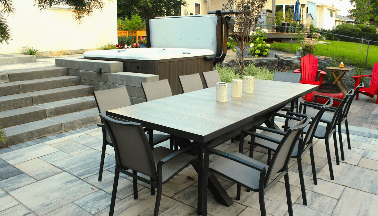 Project Goals: Our clients had recently relocated from Toronto to Winnipeg and were looking for a modern, outdoor extension of their living space. The plan called for a BBQ area, entertainment space, hot tub, and a reading corner for relaxing or working from home. They also needed more privacy, as their existing chain link fence wasn’t cutting it. One of the main challenges was that the back yard had a significant slope towards the back lane, requiring us to creatively excavate sections and bolster them with retention walls. Our team designed a bi-level patio nestled into the space to maximize usable level surface area.