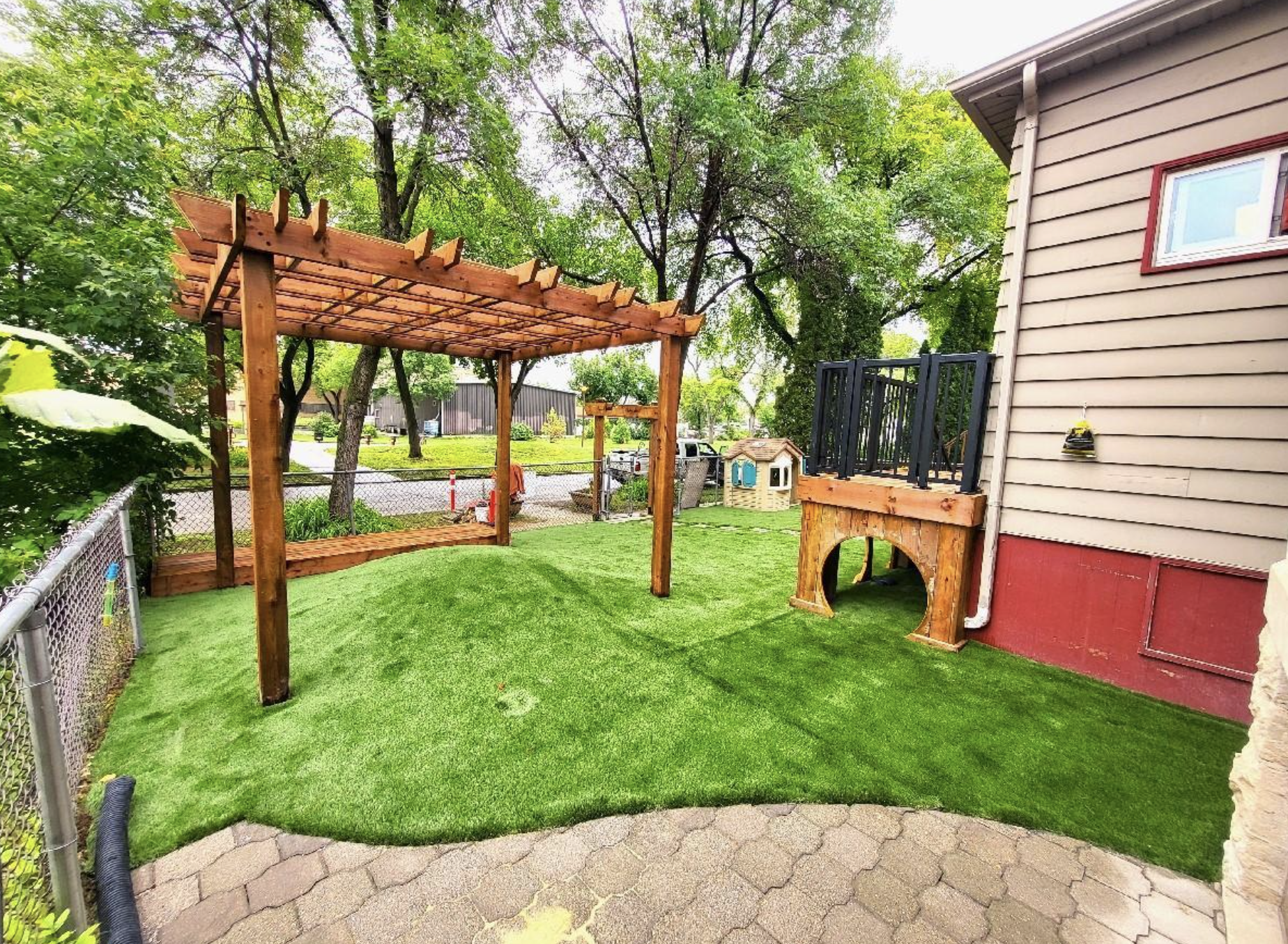 Most of the play area was covered in durable artificial turf, supplied by our local partner, Soccerland Winnipeg. Within the turf area, a stepping stone path leads from the gate to the stairs, made of 16”x16” pavers from J&D Penner. This turf will hold up for many years of wear and tear and requires virtually no maintenance. The northeast corner of the yard features a small hill for the kids to play on, shaded by a pergola and bordered by a wooden bench.